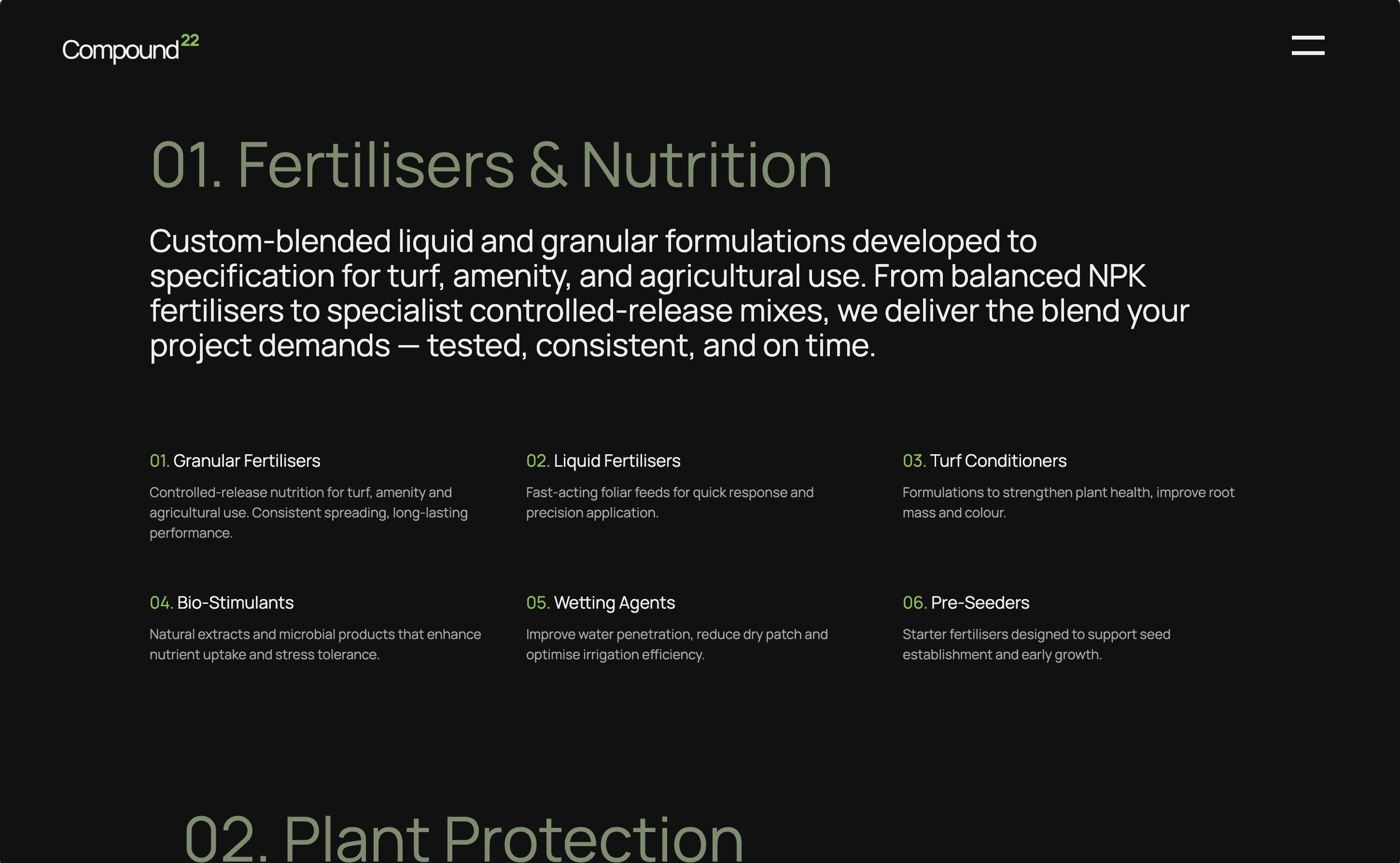 Compound 22 entered the market with a new vision for supplying professional turf, seed and fertiliser products. They needed a brand and website that immediately communicated trust, capability and industry expertise.